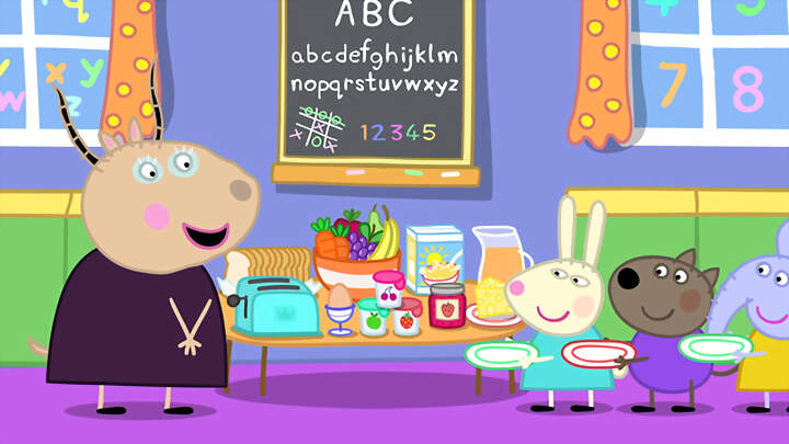 Peppa and her friends go to school early to have breakfast together.